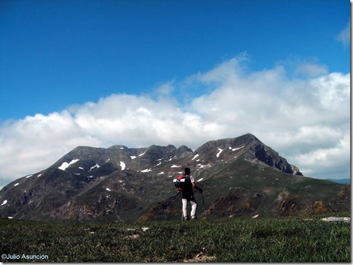 Km. 2,600 - Los hitos blancos y amarillos nos guían hasta salir del bosque de hayas. Seguimos ascendiendo por las laderas herbosas del llamado cerro de las latas, que nos van a regalar grandes vistas sobre el valle de Belagua y las montañas que nos rodean.